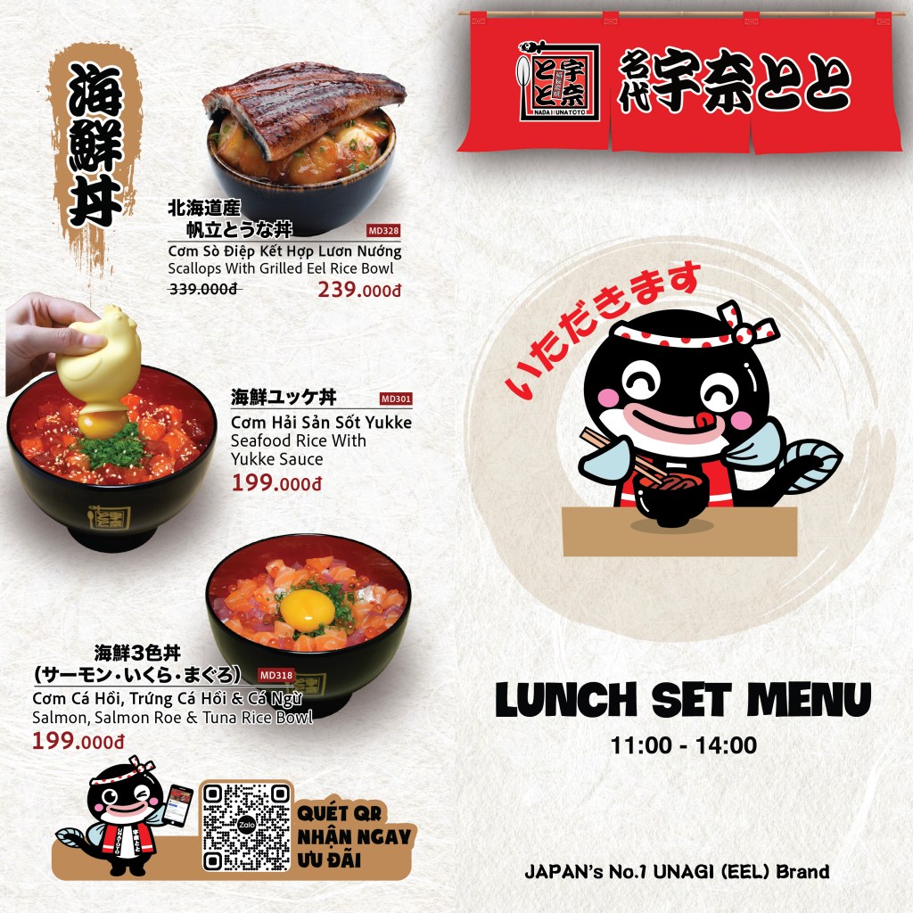 Với 12 Set Lunch phong phú, Unatoto sẽ mang đến cho thực khách những bữa trưa không chỉ ngon miệng mà còn đầy đủ dinh dưỡng. Từ các món ăn truyền thống như Unagi Don (Cơm lươn), Tempura cho đến các món hiện đại như gà nướng sốt Teriyaki hay Sashimi và Salad. Mỗi set ăn đều đầy đủ vị với nguyên liệu được chế biến tươi ngon, đảm bảo chất lượng đến thực khách.